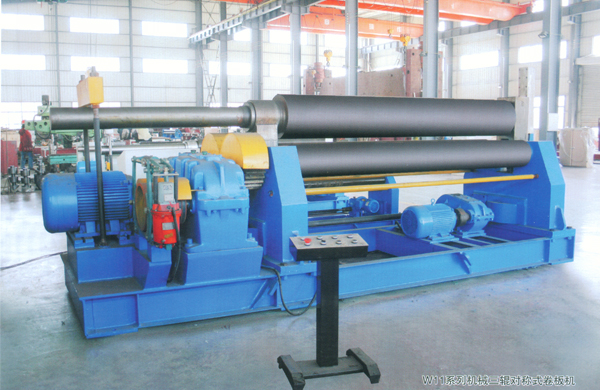 本机结构型式为三辊对称式,上辊在两下辊中央对称位置作垂直升降运动,通过丝杆丝母蜗杆传动而获得,两个辊作旋转运动,通过减速机的输出齿轮与下辊齿轮啮合,为卷制板材提供扭矩。本机床结构紧凑,操作维修方便。