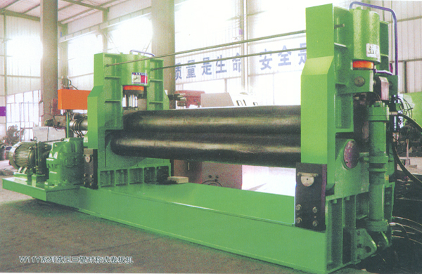 本机结构型式为三辊对称式,上辊在两下辊中央对称位置作垂直升降运动,通过液压缸内的液压油作用于活塞杆而获得,为液压传动,两下辊作旋转运动,通过减速机的输出齿轮与下辊齿轮啮合,为卷制板材提供扭矩,本机床结构紧凑,操作维修方便。